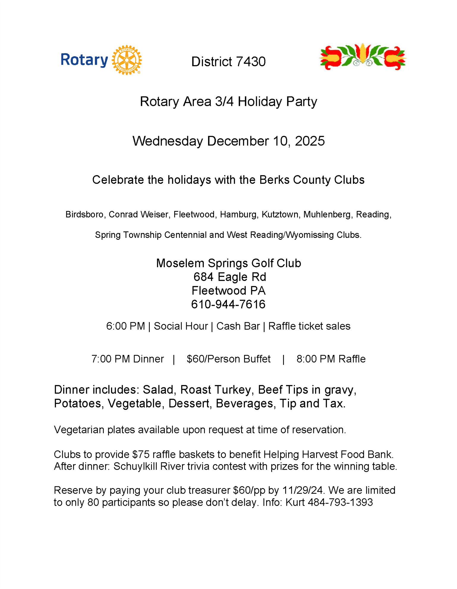 Please bring your payment to a club meeting or mail it to Kutztown Rotary Club, PO Box 127, Kutztown PA, 19530 no later than November 29, 2025. It is a multi-club event and is limited to 80 participants, so please register early.